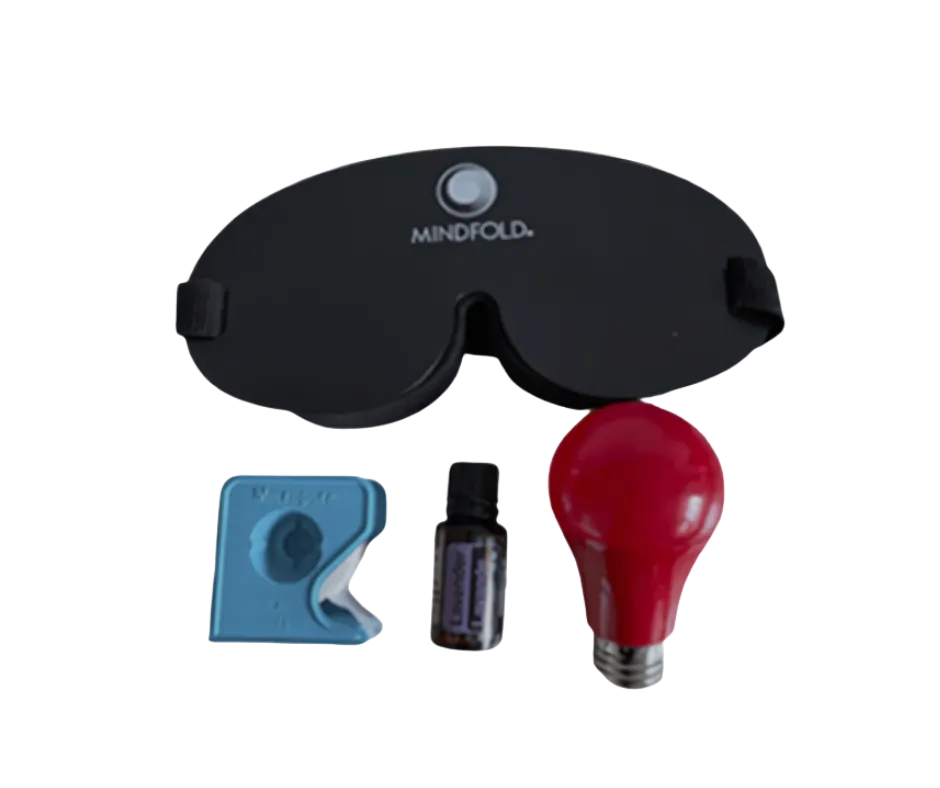 Includes an eye mask, mouth tape, lavender pillow spray, and red light bulb, to help you sleep deeper and wake up feeling more energized and refreshed. This kit is part of a health sleep routine.
